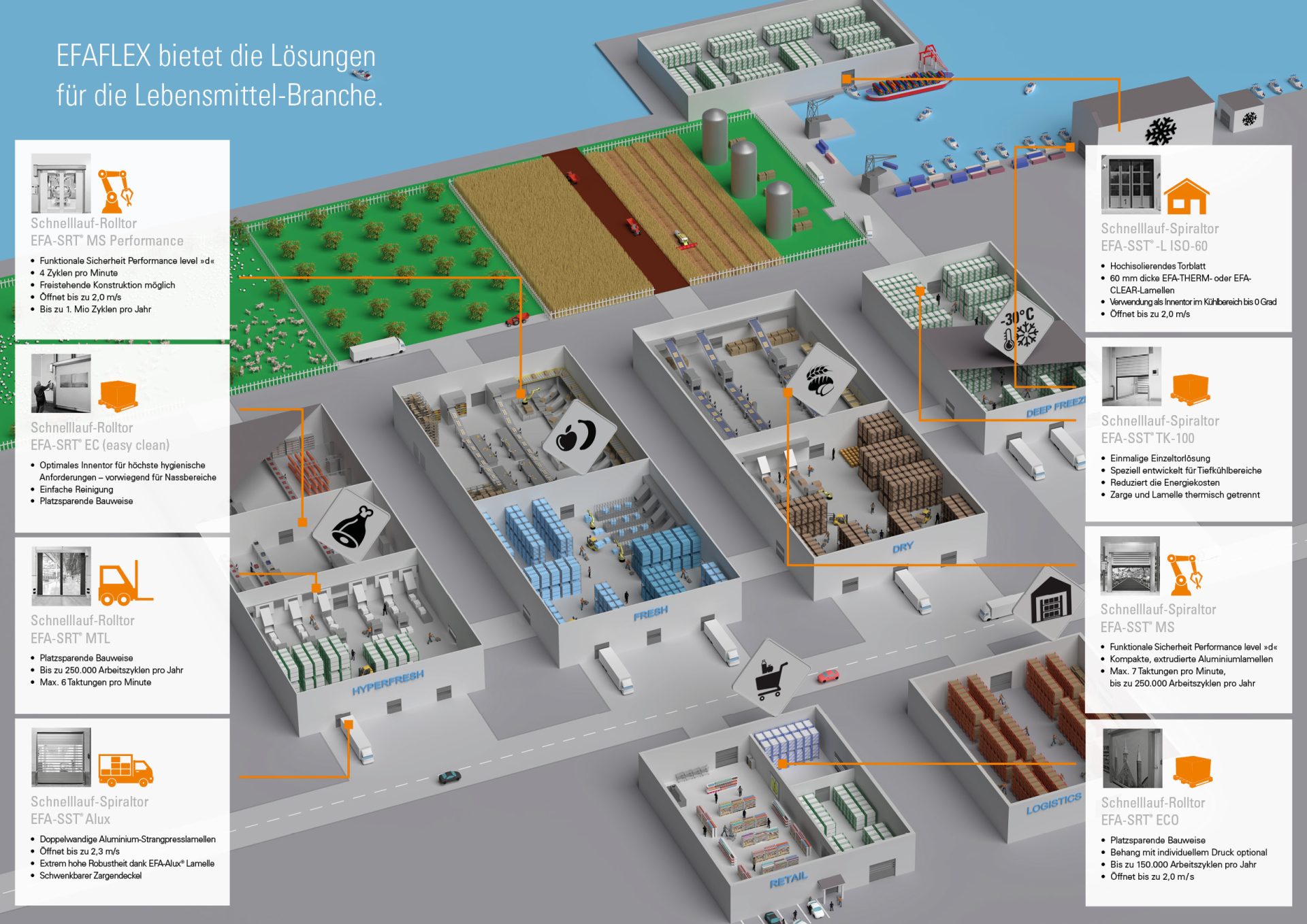 In der Lebensmittelindustrie gilt es als Hersteller von Industrietoren nicht nur höchste Hygienestandards einzuhalten, sondern auch die für die Lebensmittel kritischen Temperaturschwankungen zu minimieren. Der Verband der Lebensmittelkontrolleure e.V. empfiehlt hier ausdrücklich das EFA-SRT® EC von EFAFLEX.