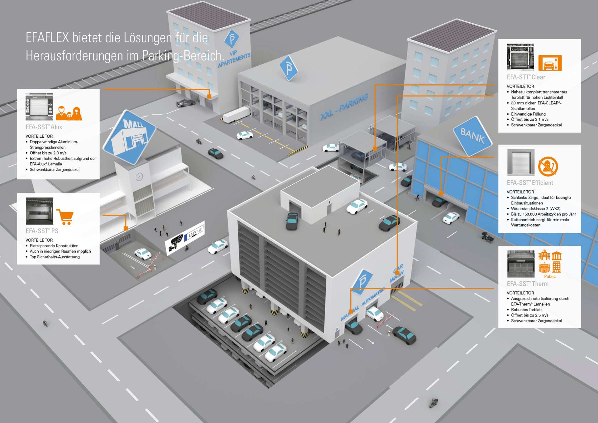 Park- und Tiefgaragen können einen sensiblen Übergang im Gebäudeabschluss darstellen. Hohe Schließgeschwindigkeiten, eine einbruchhemmende Konstruktion sowie eine auf viele tägliche Lastwechsel ausgelegte Lebensdauer sind hier die Mindestanforderungen an ein zuverlässiges Parkgaragentor. Schnelllauftore für Parksysteme von EFAFLEX verhindern den Zutritt von Unbefugten, öffnen und schließen innerhalb weniger
