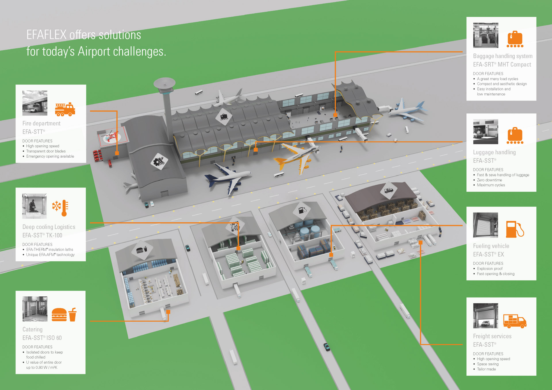 EFAFLEX a développé une gamme de portes rapides adaptées aux besoins spécifiques du secteur aéroportuaire. Ces portes ont été spécialement conçues pour des domaines tels que la manutention des bagages, la restauration et le ravitaillement en carburant, contribuant ainsi à réduire les coûts énergétiques, à améliorer la sécurité des personnes et à minimiser les temps d’arrêt coûteux. Les solutions de portes pour le secteur aéroportuaire sont rapides, efficaces, fiables et peuvent résister à des charges de vent allant jusqu’à 220 km/h.