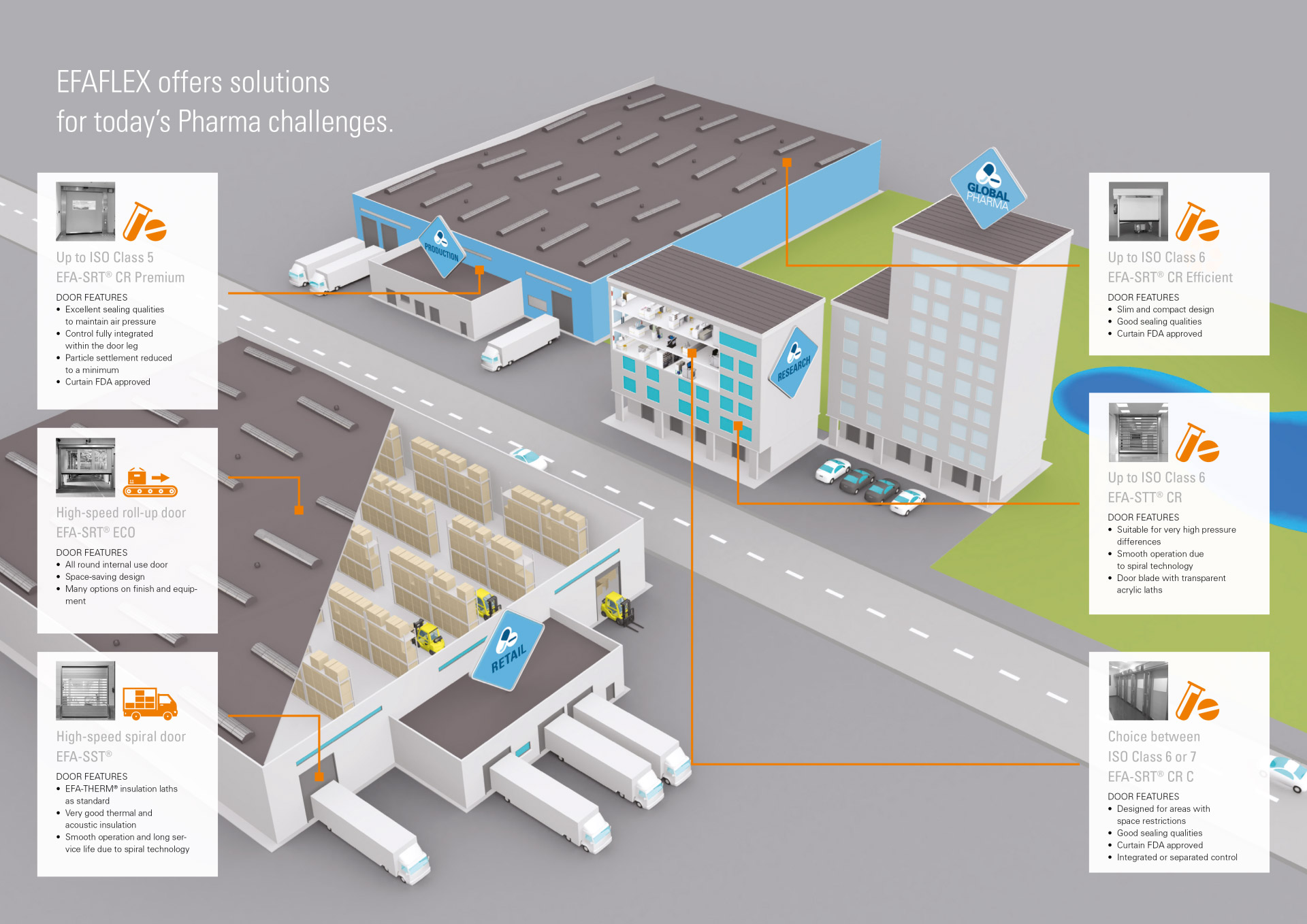 L’industrie pharmaceutique a des exigences spécifiques en matière de conception des portes industrielles : une isolation efficace, l’intégration dans un espace restreint ainsi qu’une propreté irréprochable sont la priorité absolue. Les portes rapides EFAFLEX se distinguent par leur étanchéité à l’air élevée associée à un guidage sophistiqué du tablier empêchant tout échange d’air indésirable en cas de différences de pression. En outre, la surface de structure lisse