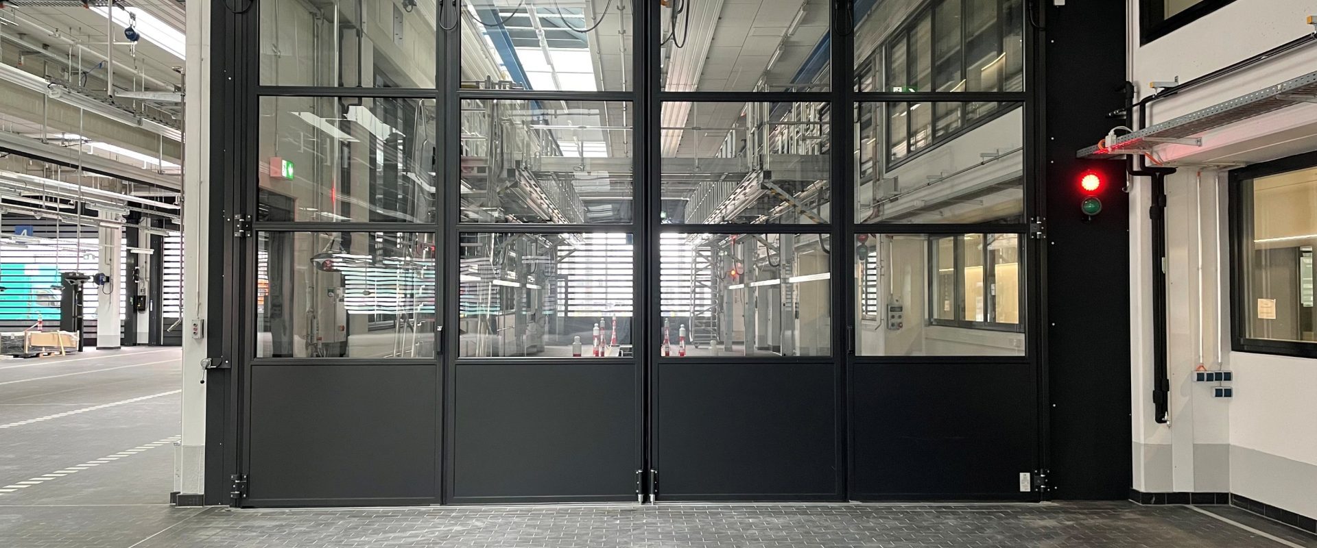 Les portes pliantes sont idéales pour l’industrie ferroviaire, tant pour les nouvelles constructions que pour les rénovations, car elles ne nécessitent pratiquement pas d’espace en profondeur et ne requièrent aucune suspension gênante. Elles offrent ainsi des avantages considérables en matière de planification, en particulier dans le domaine du transport ferroviaire de marchandises ainsi que dans les transports publics locaux et longue distance. Des découpes personnalisables permettent l’intégration de fils de contact, de caténaires, de téléphériques ou d’autres passages techniques.
